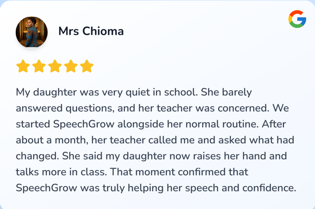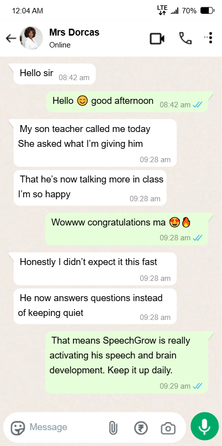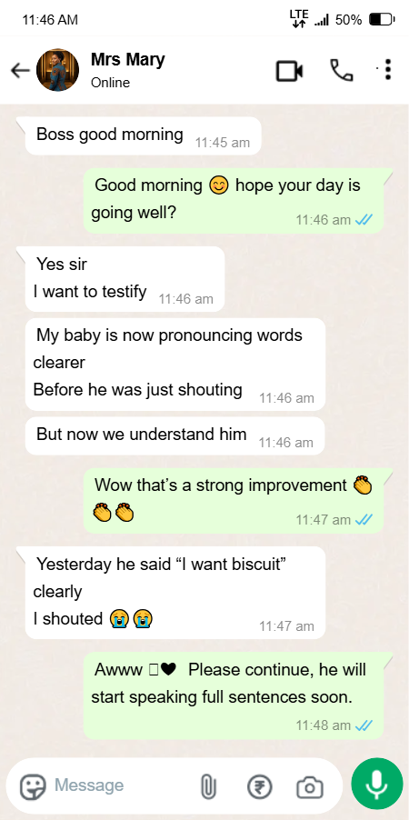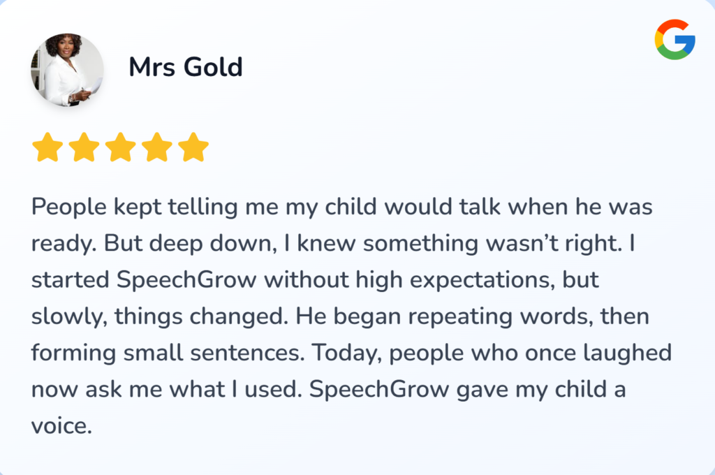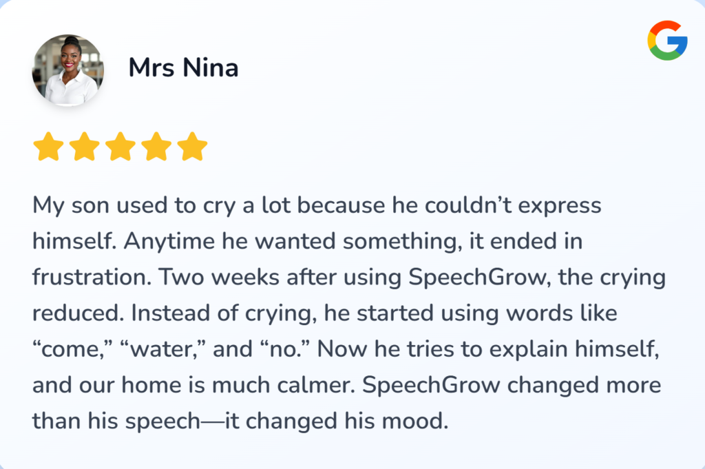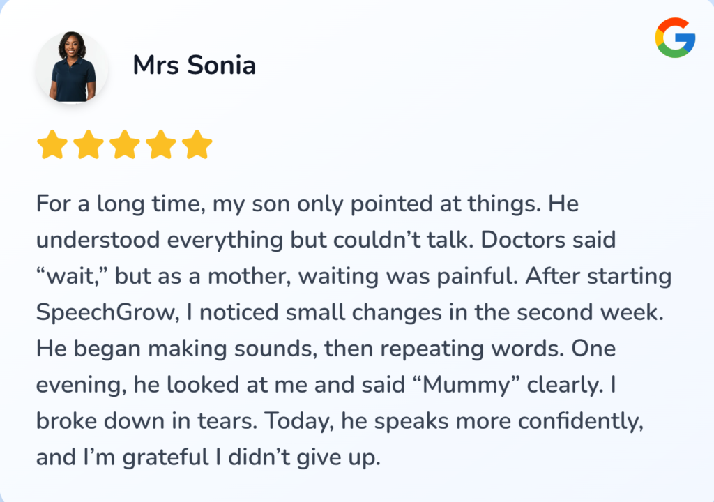 I felt helpless and blamed myself sometimes. I started SpeechGrow after someone recommended it. Within 2–3 weeks, he began repeating simple words. By the end of the first bottle, he started saying “Daddy come” and “Mummy help.”